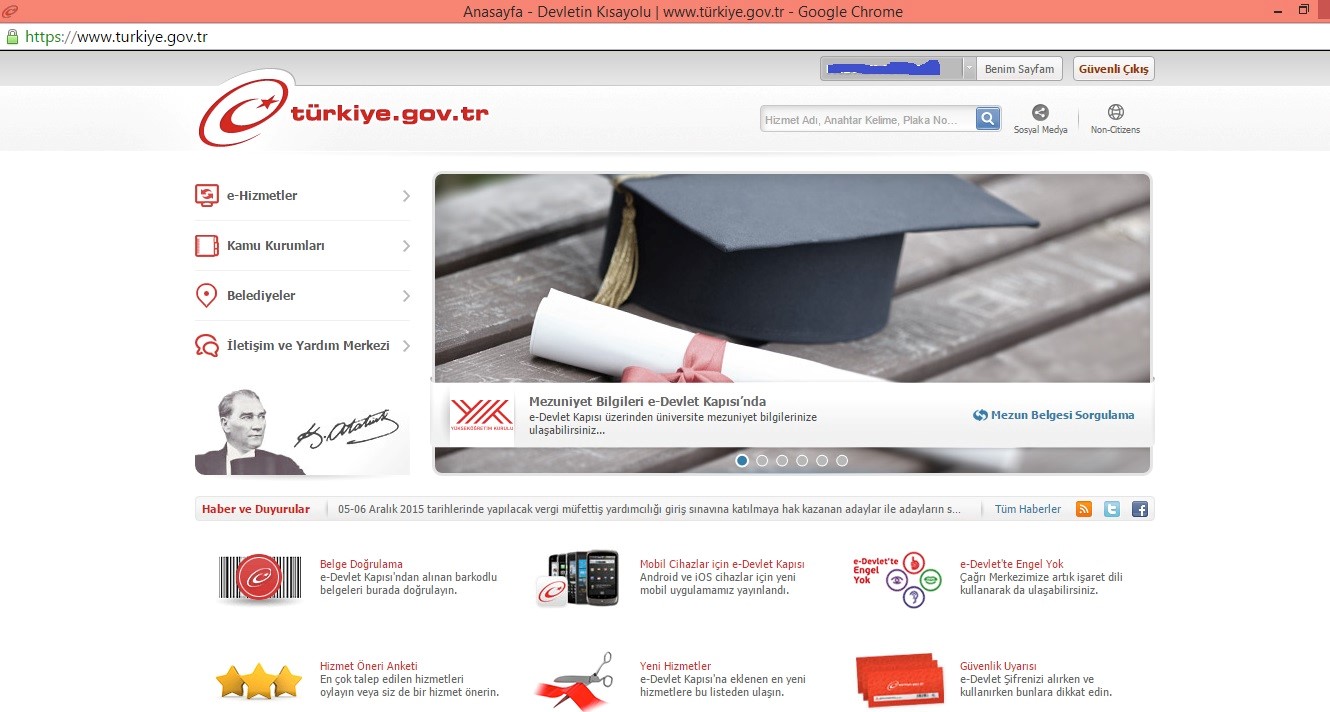 Bu adımları geçtikten sonra, e-Devlet sisteminin ana ekranına girmiş olduk. Bu ekran ile karşı karşıya gelmişsek, doğru adımları gerçekleştirmiş olduğunuzu söyleyebiliriz. Daha sonraki adımları gerçekleştirmek için aşağıdaki anlatılanları gerçekleştirmeliyiz.